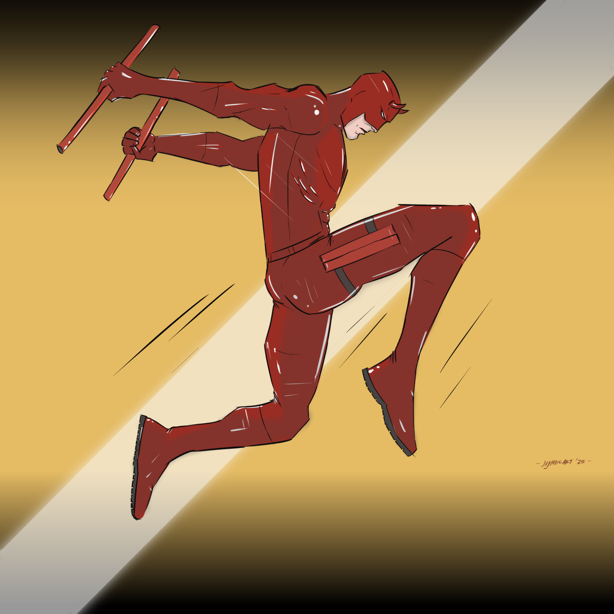The Man Without Fear showcasing his acrobatic and very agile skills leaping through as he does at night in the viscous streets of Hell’s Kitchen.